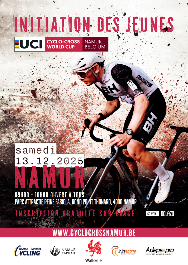 En collaboration avec la Ville de Namur, Golazo Sports, en tant qu’organisateur du Cyclocross de Namur, souhaite à nouveau faire profiter les plus jeunes sportifs d’un évènement international et ainsi participer au développement de leur passion. Pour ce faire, nous offrons aux enfants la possibilité de découvrir une partie du spectaculaire parcours de la Citadelle. Le samedi 14 décembre, veille des courses professionnelles, et encadrer par des moniteurs, les enfants pourront tester le circuit qui rend la coupe du monde namuroise si particulière !
